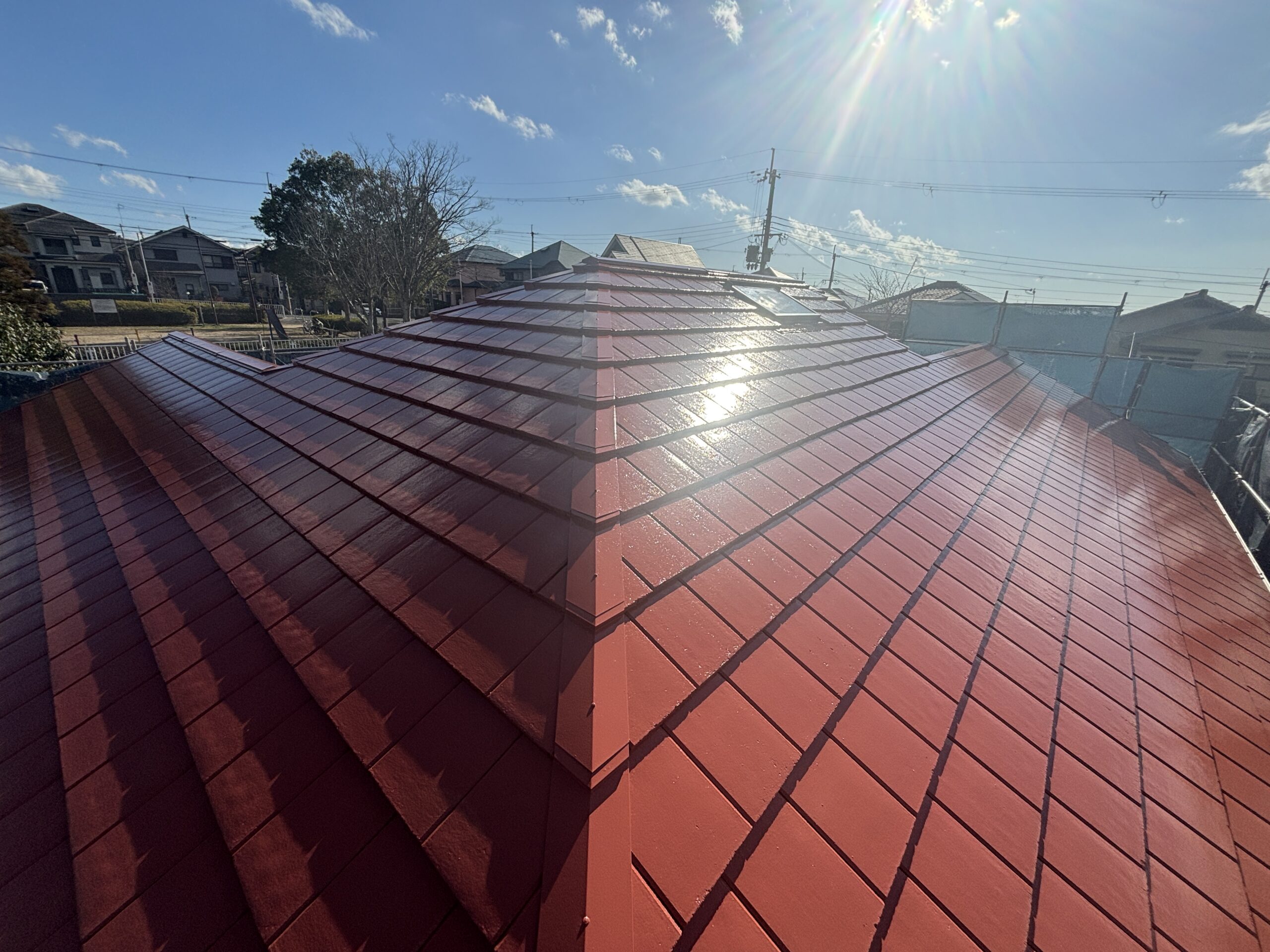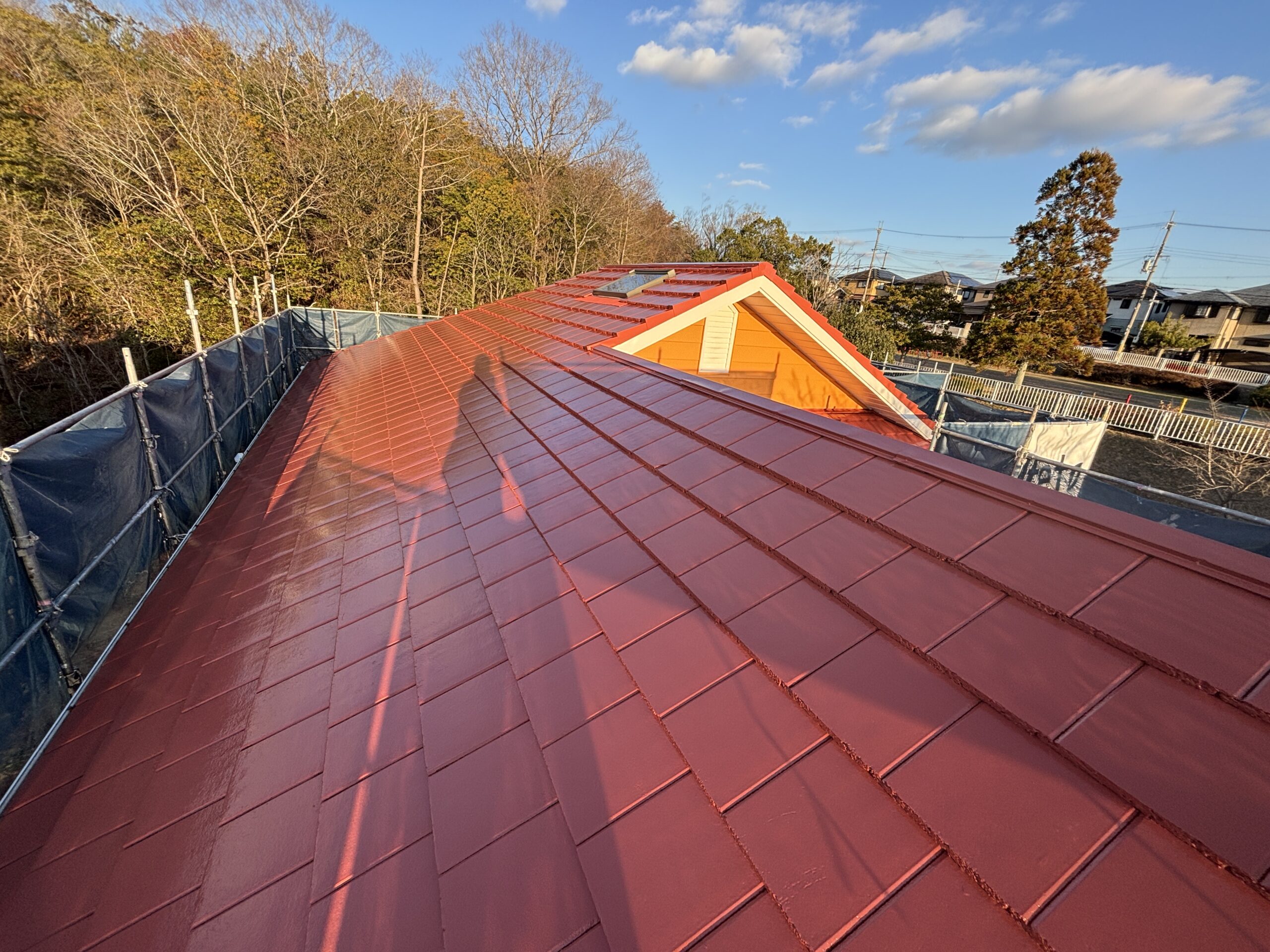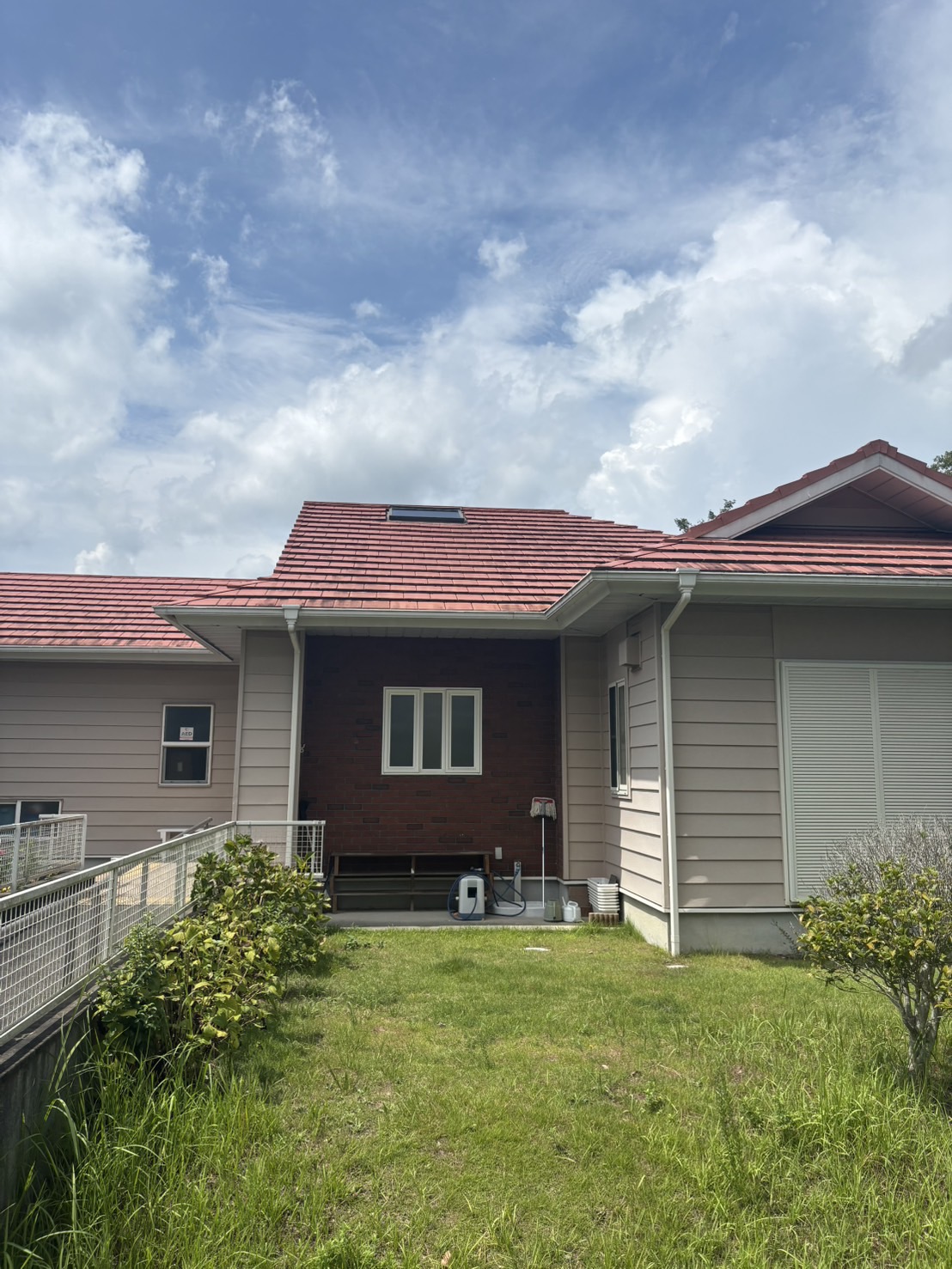 既存のイメージを大きく変えないよう、現状に近い赤系の色味を採用し、綺麗に塗り直しています。外壁のオレンジ色との相性もよく、建物全体が引き締まった印象になりました。