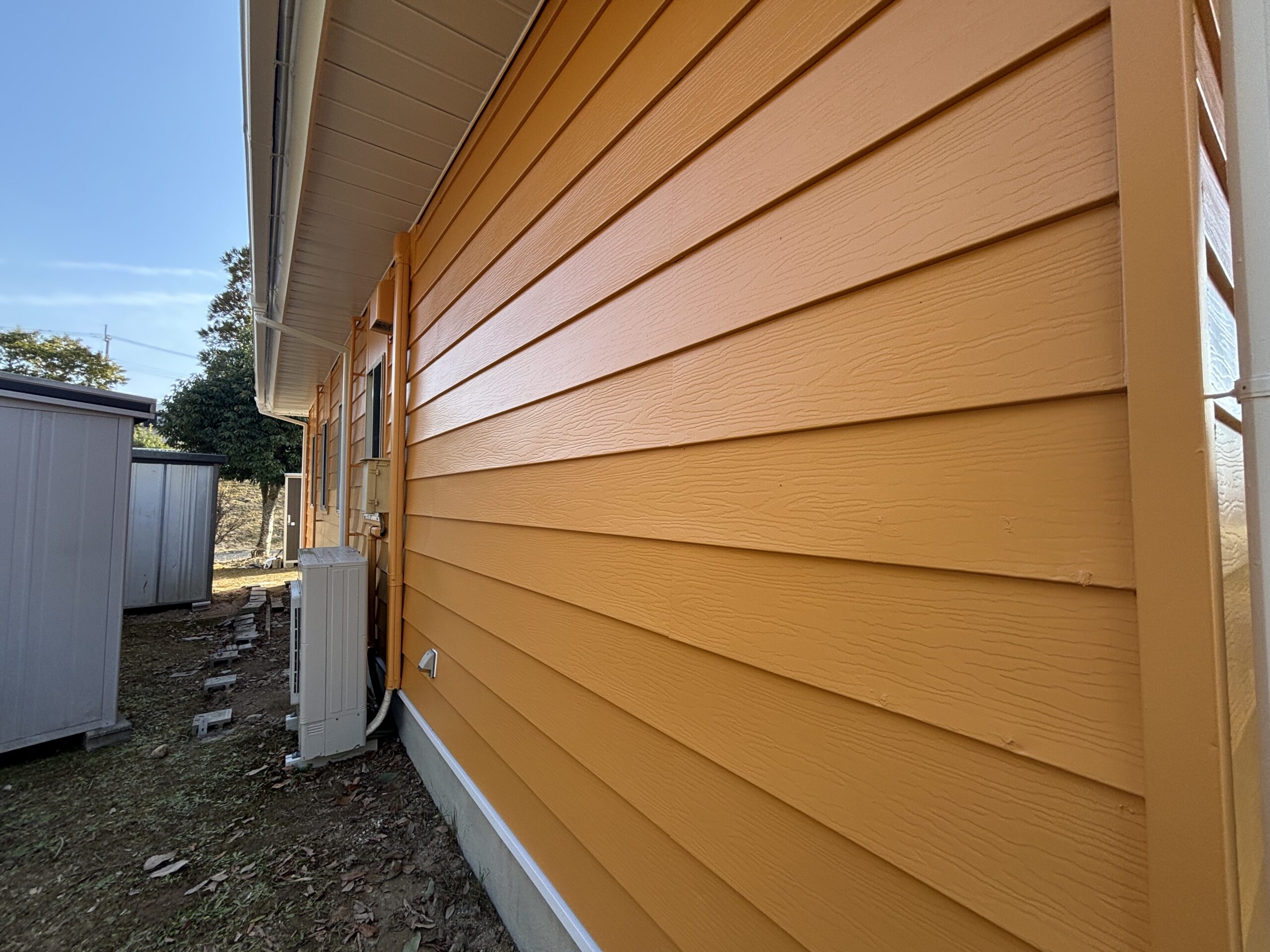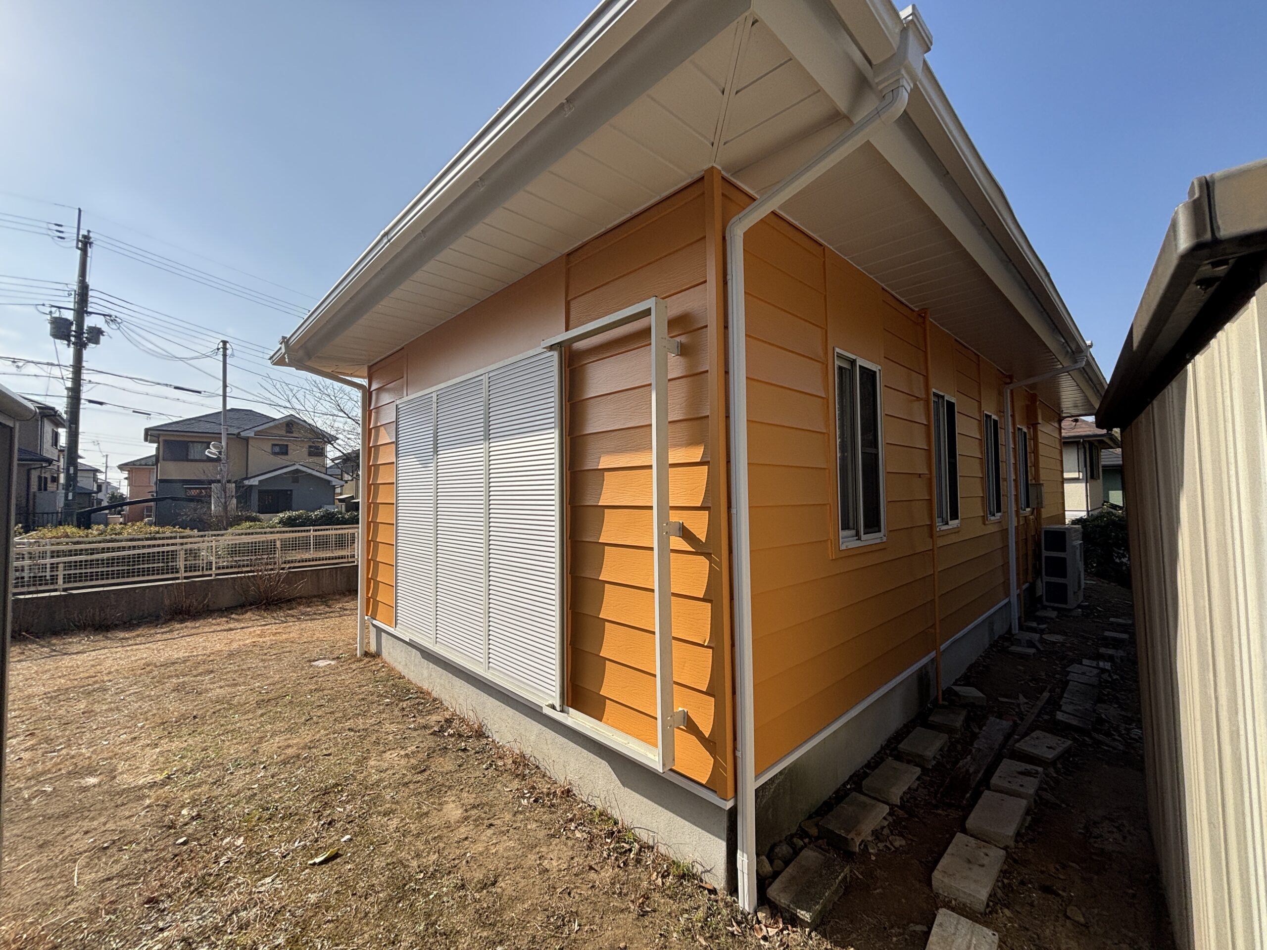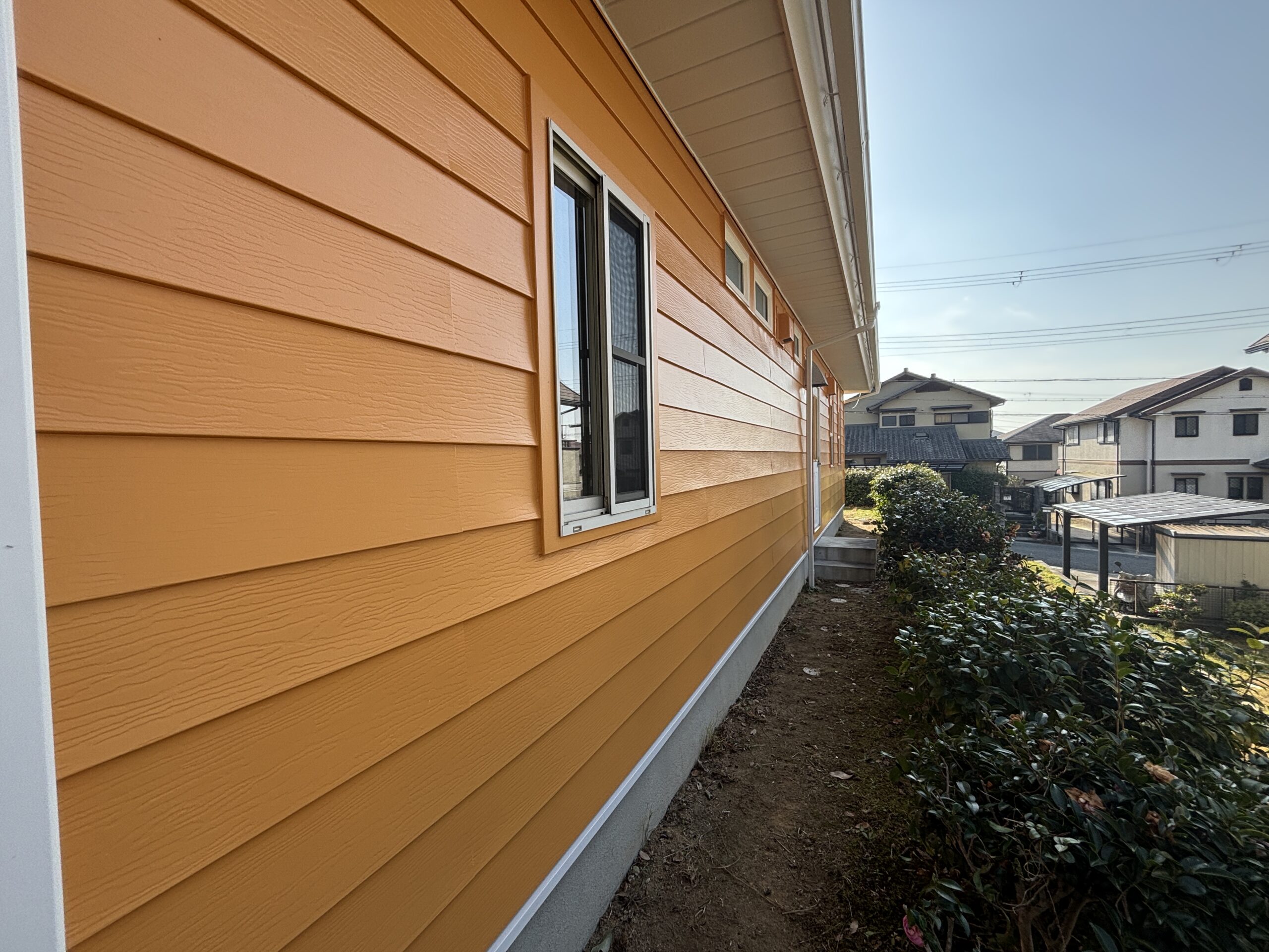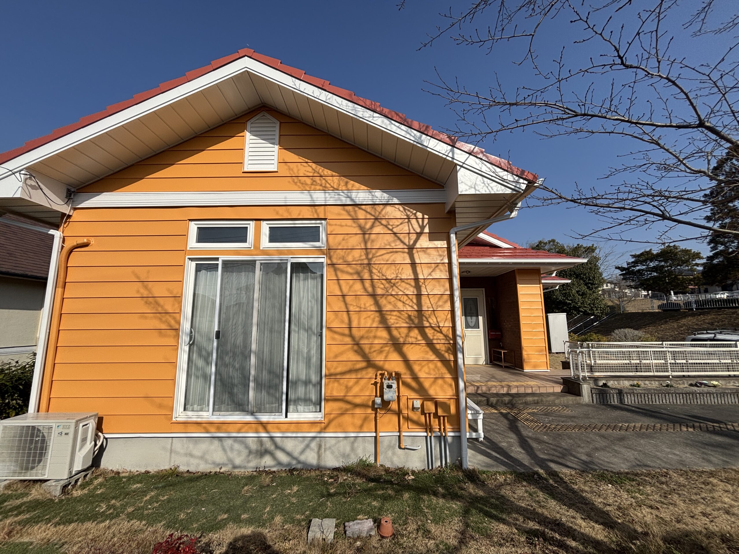 オレンジ色の外壁に、白い破風・鼻隠し・樋がアクセントとなり、清潔感のある印象に仕上がりました。